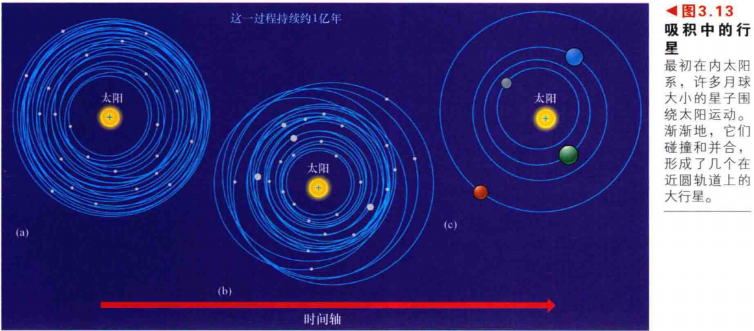 20.星子的引力已强大到足以清扫物质------否则这些物质将无法与星子相撞,星子的增长速度加快,使它们能够形成较大的天体,如图3.9a和3.9b所示。由于较大的天体有较强的引力,最终几乎所有的原始材料都被扫成了几颗大的原行星。并最终演变成我们今天所知道的行星,如图3.9c所示。